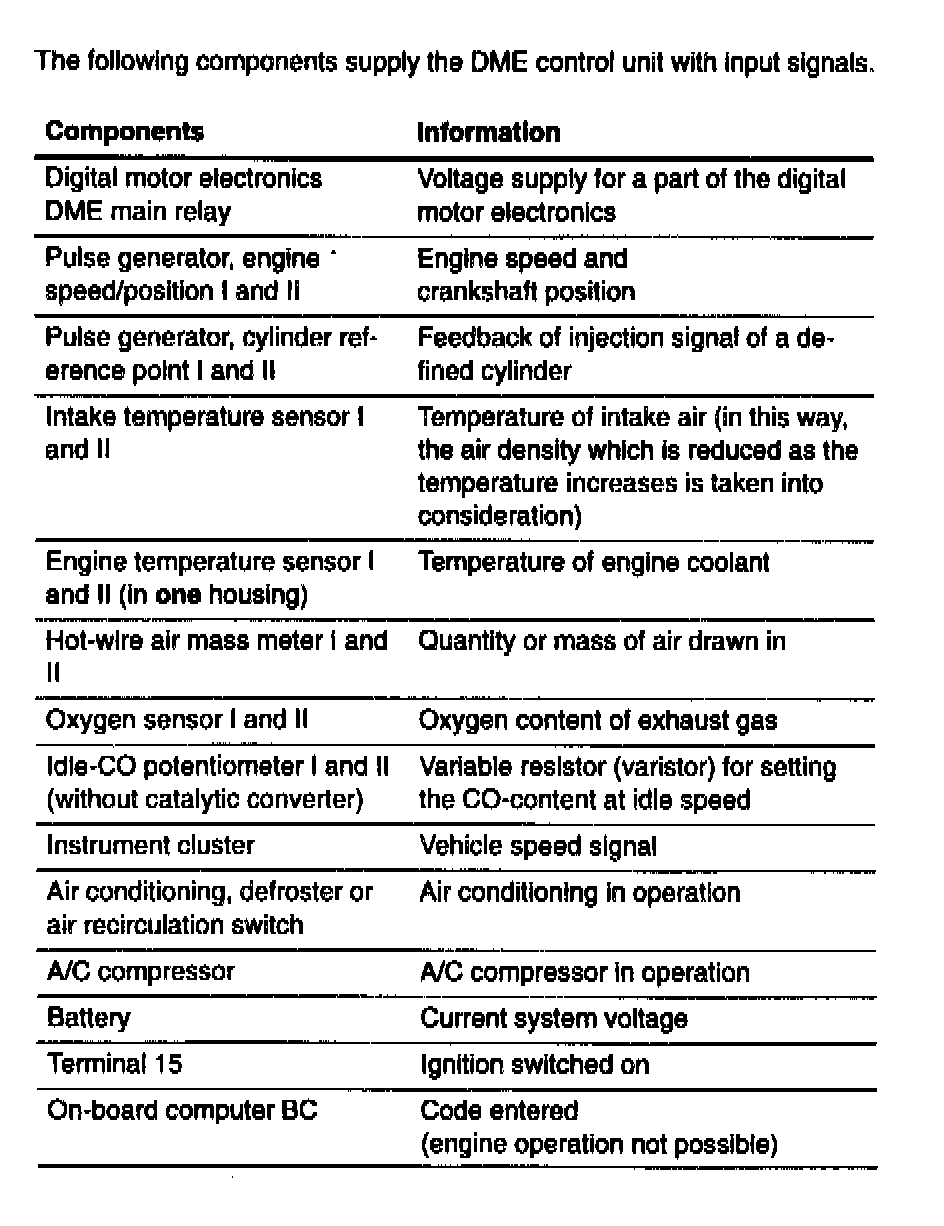 The DME control unit I supplies the cylinders 1...6, and the identical control unit II supplies the cylinders 7...12. To differentiate between them for diagnosis, Pin 40 of the control unit II is connected to ground. The associated components are mainly provided double. Exceptions are:
