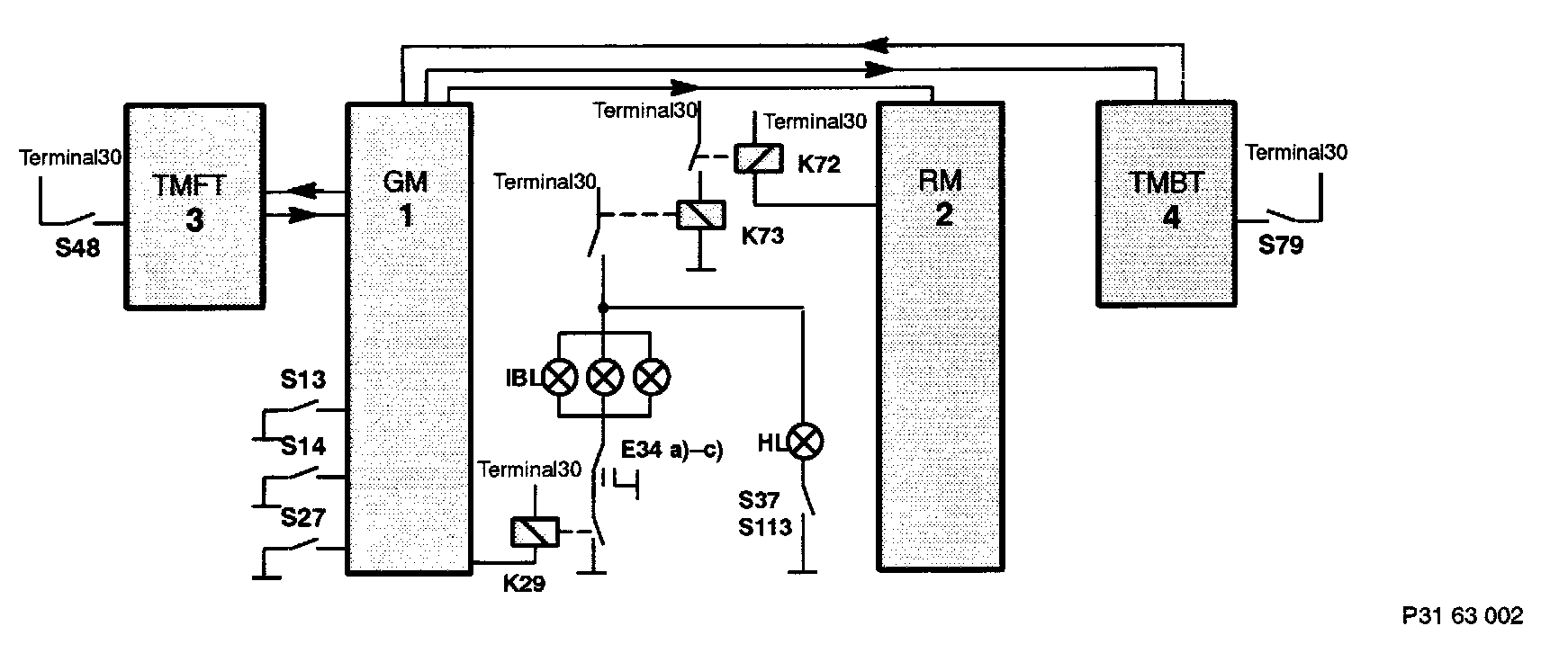 The interior lights system (LB) is controlled by the general module (GM) of the ZKE II. During automatic operation, the LB lamps are switched by means of an individual relay which is driven by the general module (GM). The relay switches ground to the LB switch. U-batt for the LB lamps is switched via the load cut-out facility.