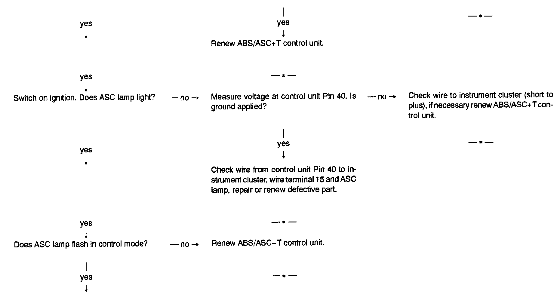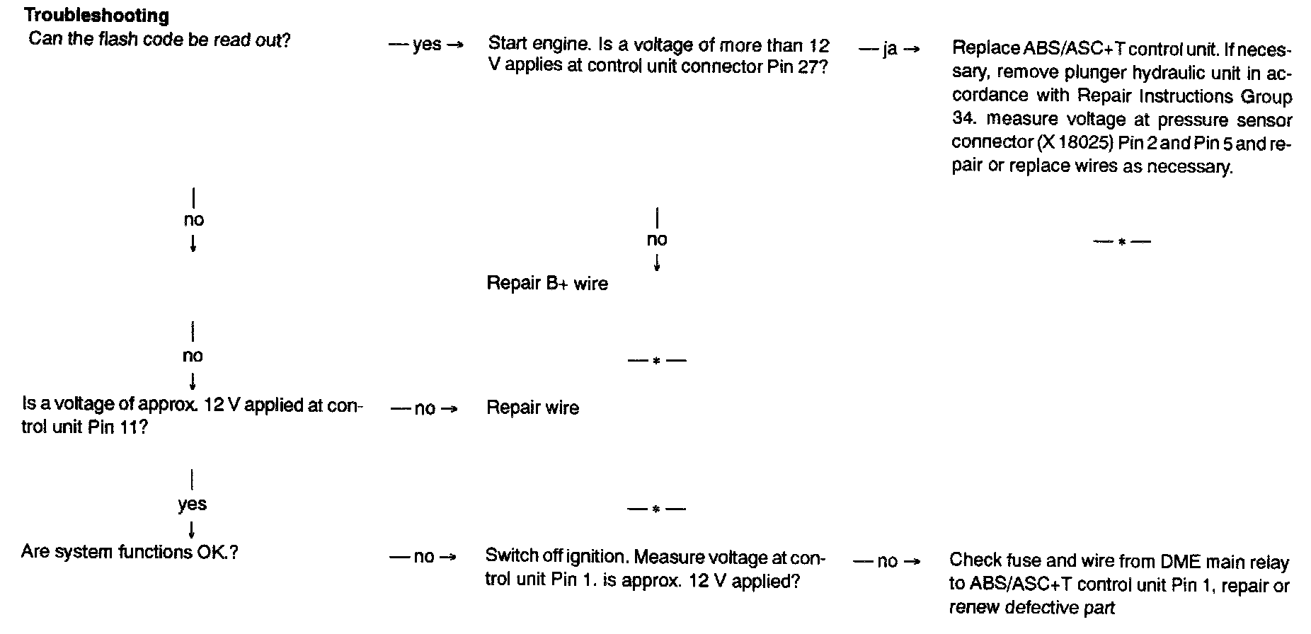 Connecting wire at ABS/ASC+T control unit from Pin 15 to Pin 34 (wire jumper) must be open