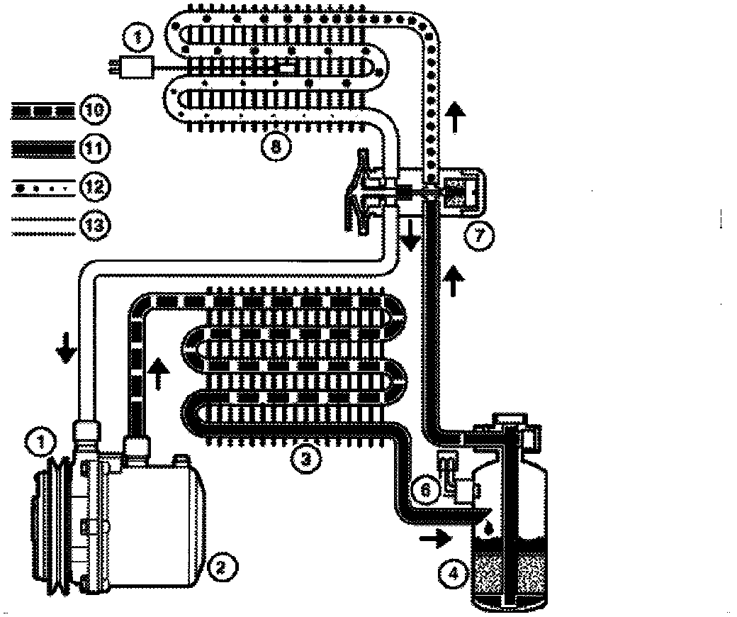 The compressor, a major component of the system, increases the pressure of refrigerant vapors. Refrigerant vapors are drawn in on the intake side of the compressor. The refrigerant is compressed, whereby the vapor temperature rises. The high-pressure vapors pass via a high pressure pipe to a condenser located on the face of the engine radiator. The hot refrigerant is cooled off by wind from driving and an additional fan. Refrigerant vapors condense and turn into liquid when reaching the dew point temperature. The high pressurized refrigerant is delivered to the drier. the drier flask extracts particles of dirt, humidity and even acid from the refrigerant but only to the extent of approx. 6..10 grammes in R12 systems and 10...16 grammes in R 134a systems.