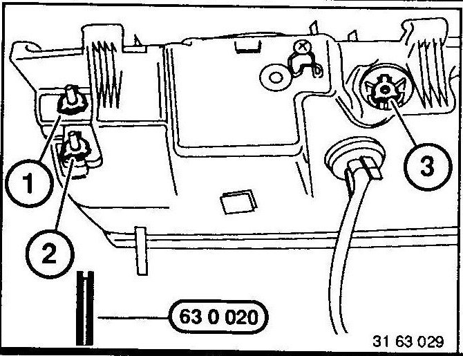 Turn mounting nuts of adjusting screws (1 and 2) and mounting screw (3) with Special Tool 63 0 020 so far until the console can be pulled out.