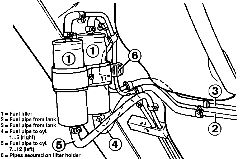 - Remove the lower hoses (4 & 5) from the fuel filters.