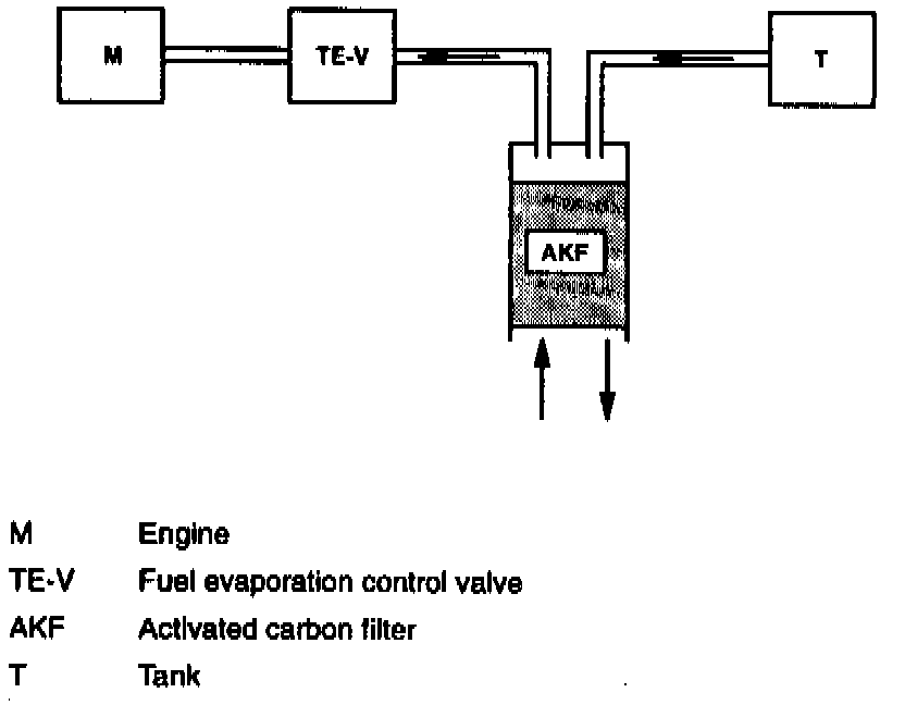 Since this additionally supplied mixture influences combustion to a considerable extend, the fuel evaporation control valve consists of a non-return valve and an electrically operated valve. Due to the non-return valve, the fuel evaporation control valve is closed initially when no power is applied. The non-return valve prevents fuel collecting in the air manifold when the vehicle is parked. This non-return valve opens as vacuum increases in the air manifold. Electrical activation takes place dependent on engine speed and load. The venting cycle (flushing phase) begins as soon as the emission (lambda) control system is active. On completion of one cycle, the valve is closed for approx. 1 min. (rest phase).