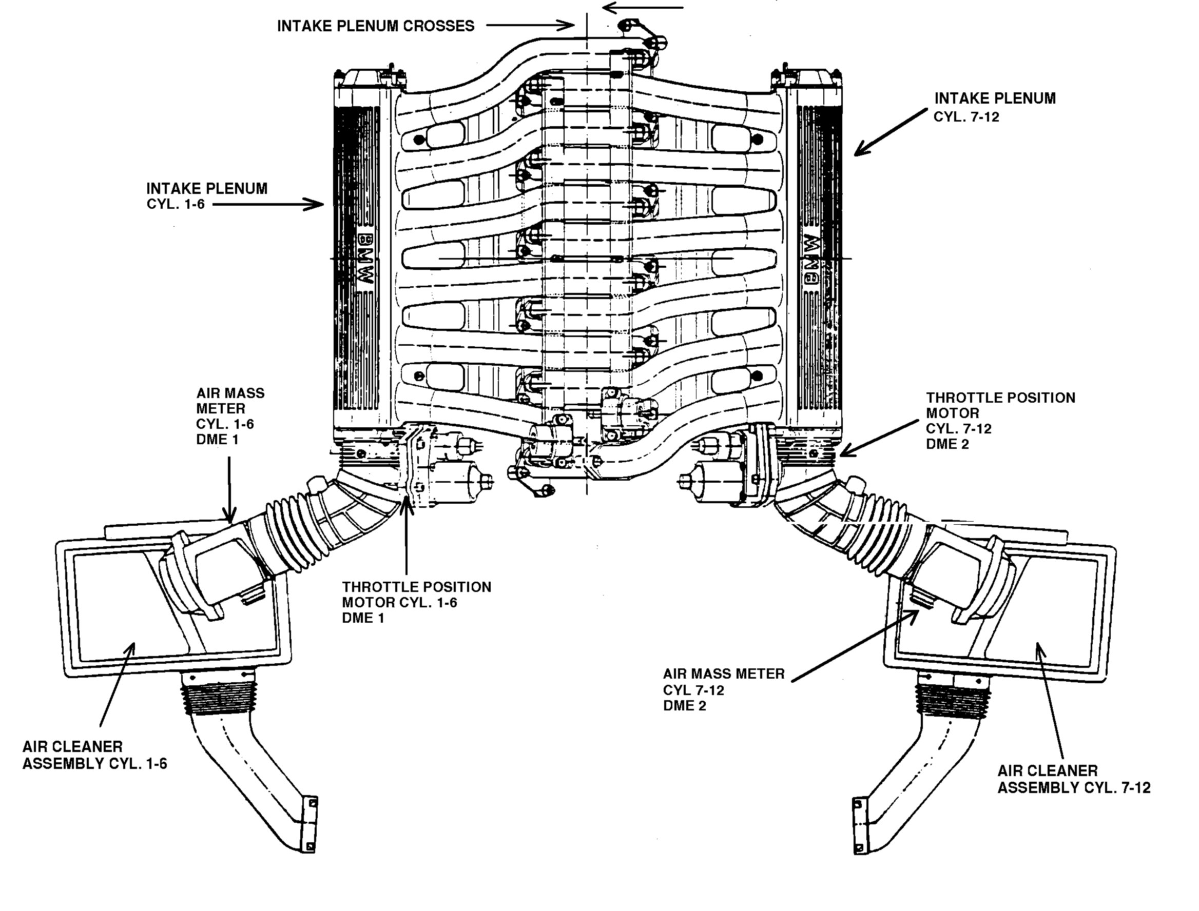 NOTE: To achieve good mid-range torque characteristics, long air intake pipes are used. This method of induction requires that the plenum chamber for the left bank (cylinders 7-12) be mounted on the right side of the engine, and the plenum for the right bank (cylinders 1-6) be mounted on the left side of the engine. Technicians must keep this in mind when referring to component locations and testing procedures. Components such as air intake sensors, air mass sensors, injectors, throttle position motors and induction systems may be misdiagnosed because of the possible confusion. Remember that fault codes will always refer to the DME system (DME system 1 = cyl. 1-6) and (DME system 2 = cyl. 7-12).