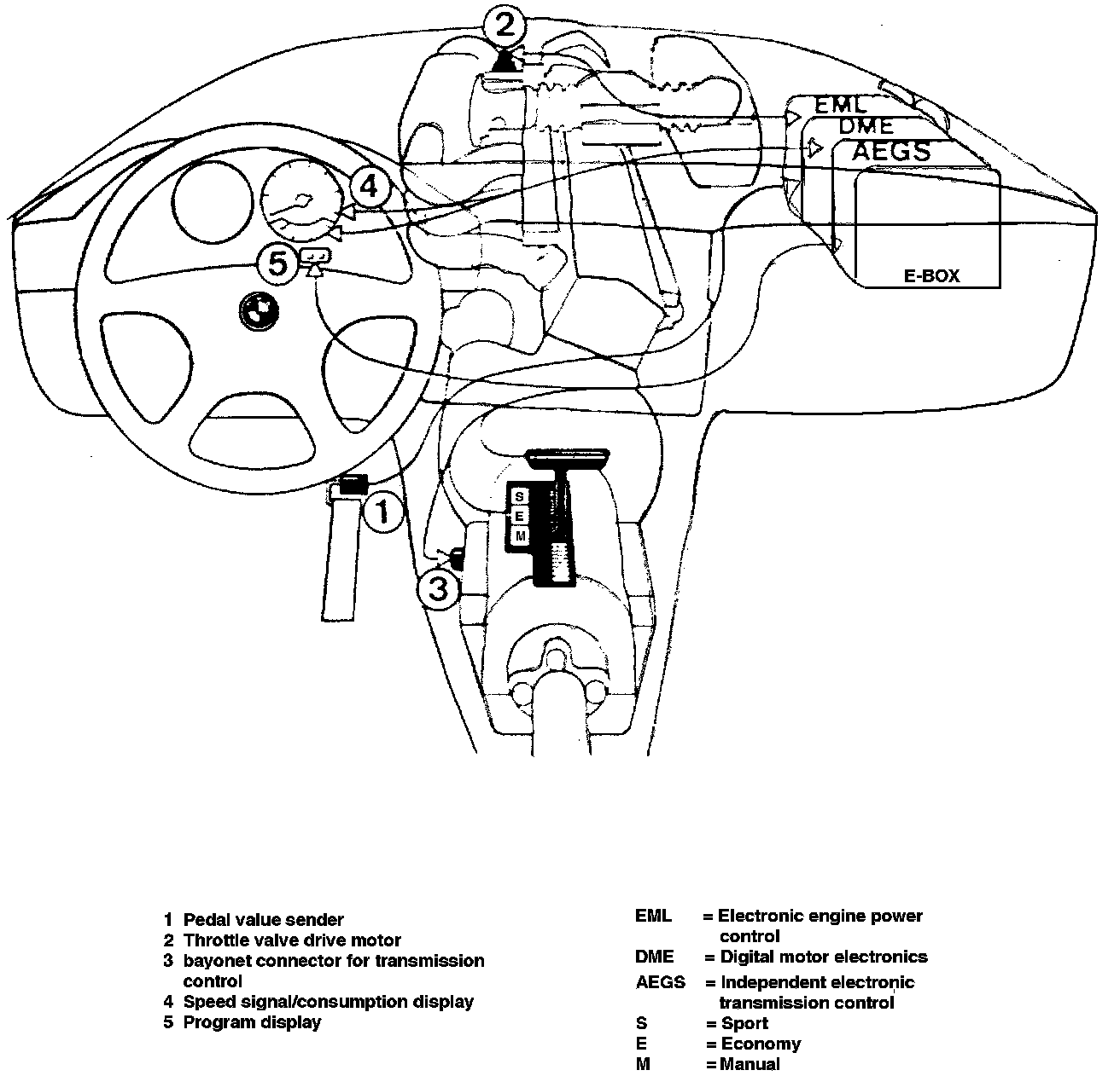 The BMW V12 engine uses two Motronic (DME) engine control systems. DME control unit 1 controls cylinders 1-6, and DME control unit 2, cylinders 7-12. Each Motronic system is complete and independent of its counterpart and is capable of running the engine on 6 cylinders in the event of a system failure. An electronic throttle control system (EML), controls throttle operation and coordinates the separate DME systems. Various engine sensors and other systems (i.e.. air conditioning, auto transmission etc.) supply each DME control unit with operating information. The DME control units process the input information and send output signals to adjust injector pulse width and ignition timing.