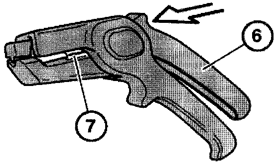 Slide upper handle of insulation strippers (6) in direction of arrow until cutting tool (7) becomes visible. Open pliers in final position and hold in this position.