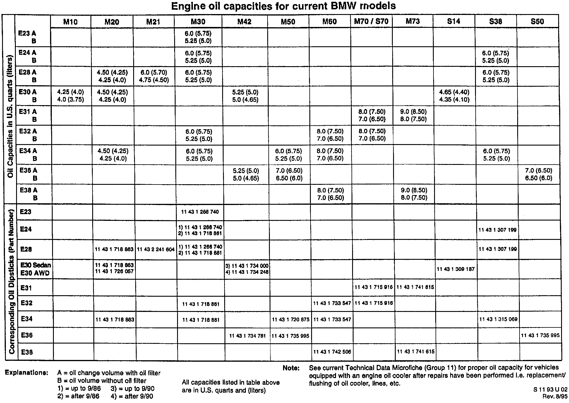 The table shows all engine oil capacities for current BMW engines. These data will be included in the next edition of the technical data microfiche.