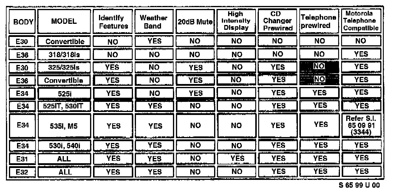 Refer to S.I. bulletin number 65 09 91(3344) for further information. Affected '93 MY 535i Pioneer radios can be identified by a "535i ONLY" decal on the side of the radio.