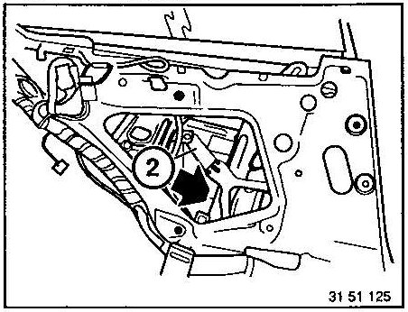 Hold side window tight, press in at top and swing adjusting screw (2) out of the window regulator at the bottom.