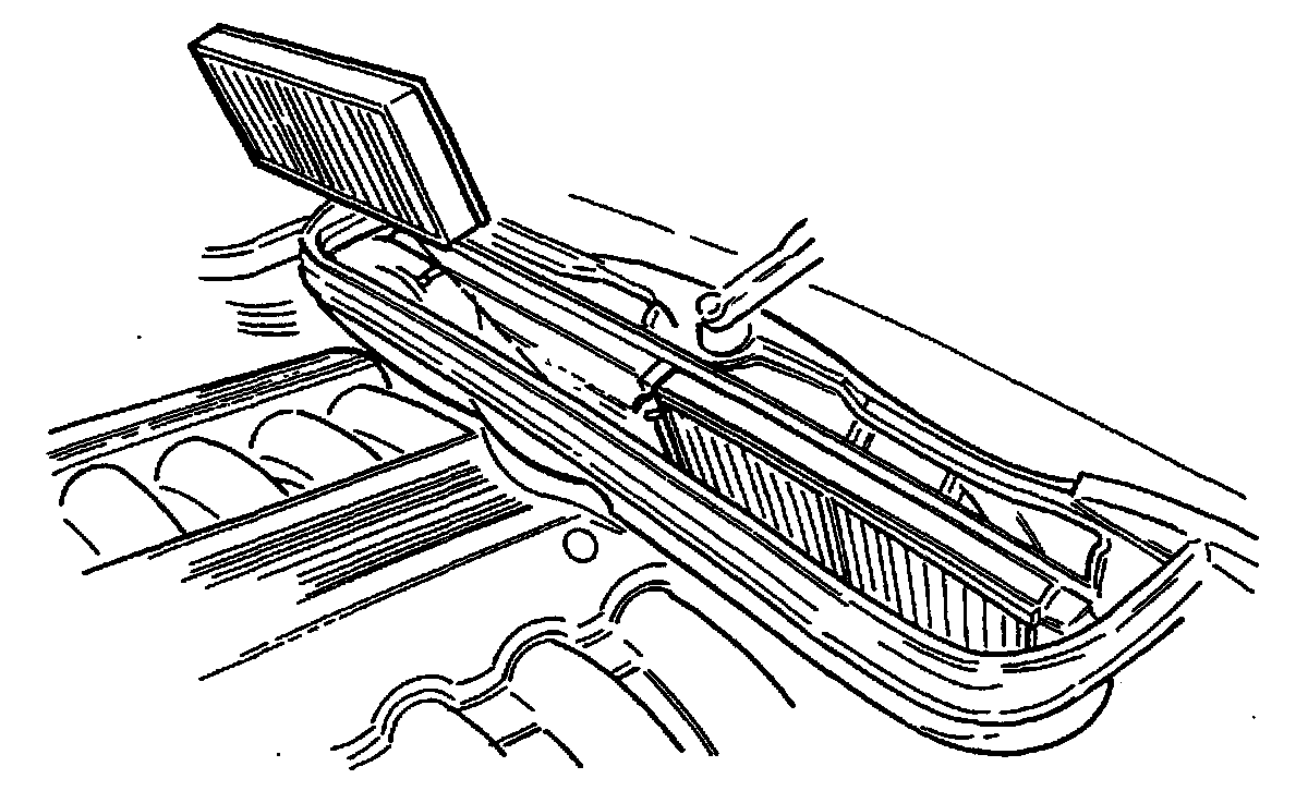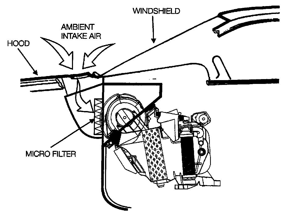 The filter fits inside a housing that mounts to the front side of the engine compartment bulkhead. Fresh air flows down through ducts behind the hood and into the filter housing. Only after passing through the microfilter does the filtered air enter the IHKA housing assembly through the fresh air flaps.