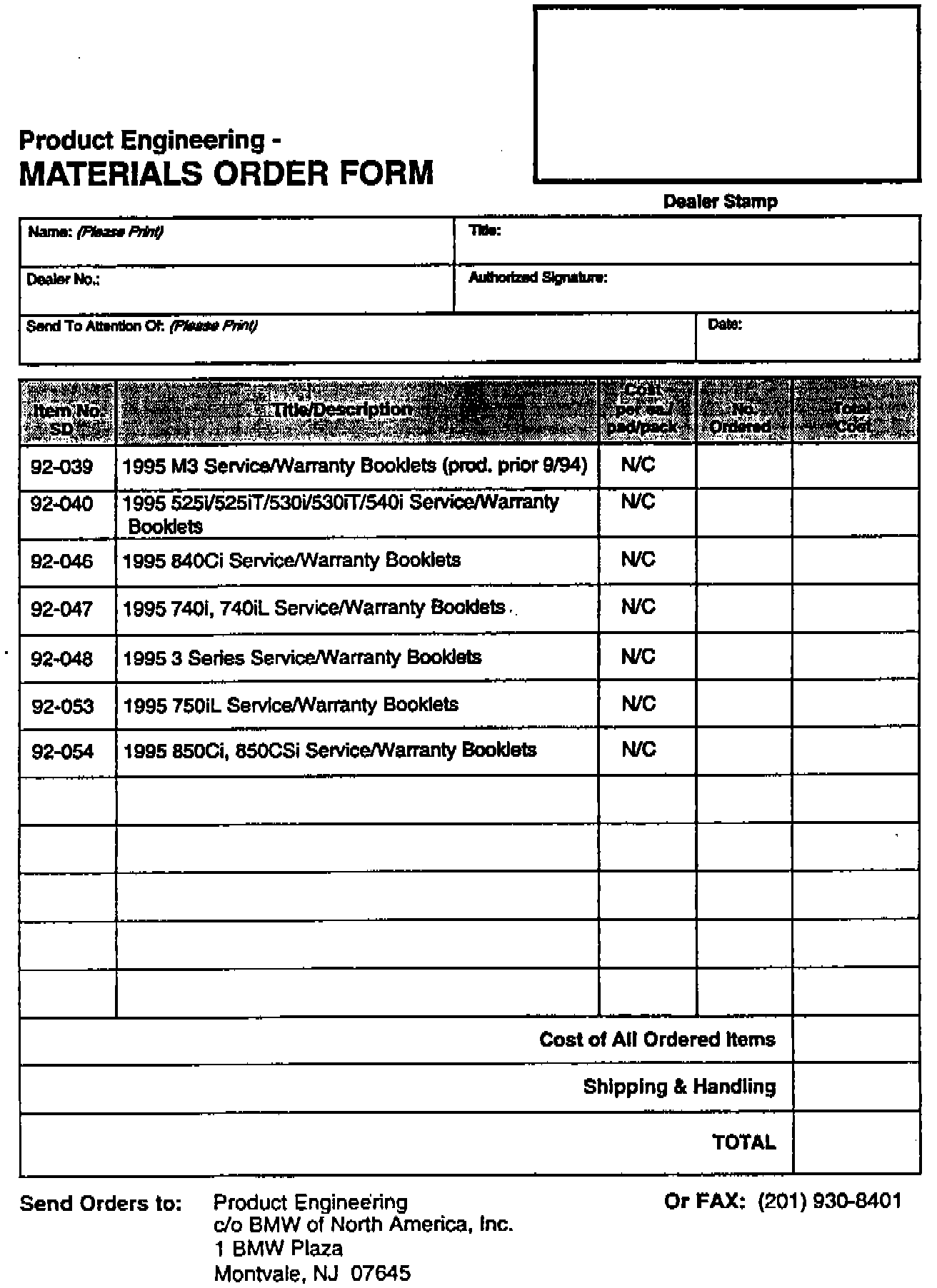A copy of the 1995 850Ci/850CSi combined Service/Warranty Information booklet, together with a copy of this Service Information bulletin will be sent under separate cover to every automotive BMW Dealer addressed to the attention of the Sales Manager and Service Manager. Please review this booklet and become familiar with the service, maintenance and warranty coverage information.