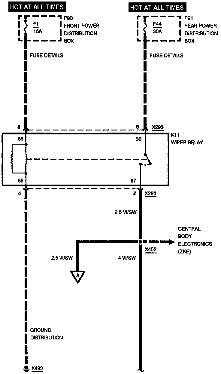 7. The dashed line from pin 4 of connector x293 to ground X493 shows the ground supply for relay K11. If required, refer to cell 0670.4 Ground Distribution at ground X493 for the complete line progression with all plug connections, line branches, wire colors, and cross sections.
