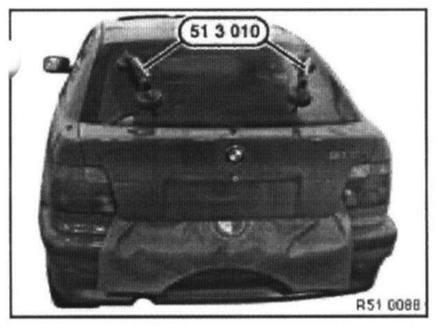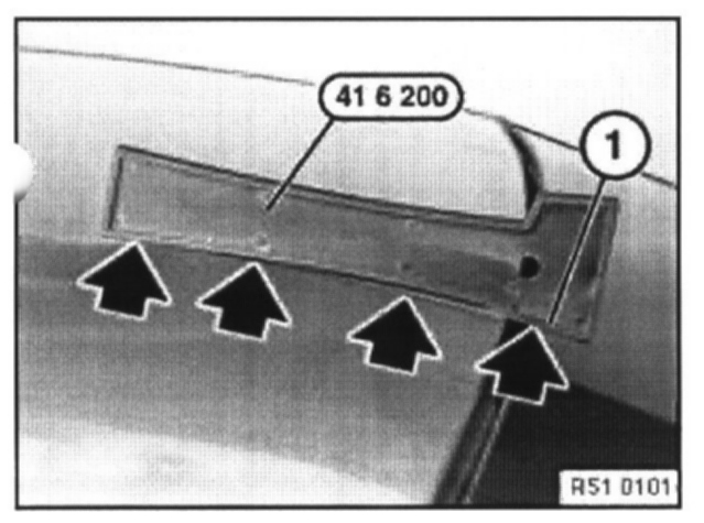 Fit special tool 41 6 200 (left and right over the hinge) with the short leg (1) facing the rear window.
