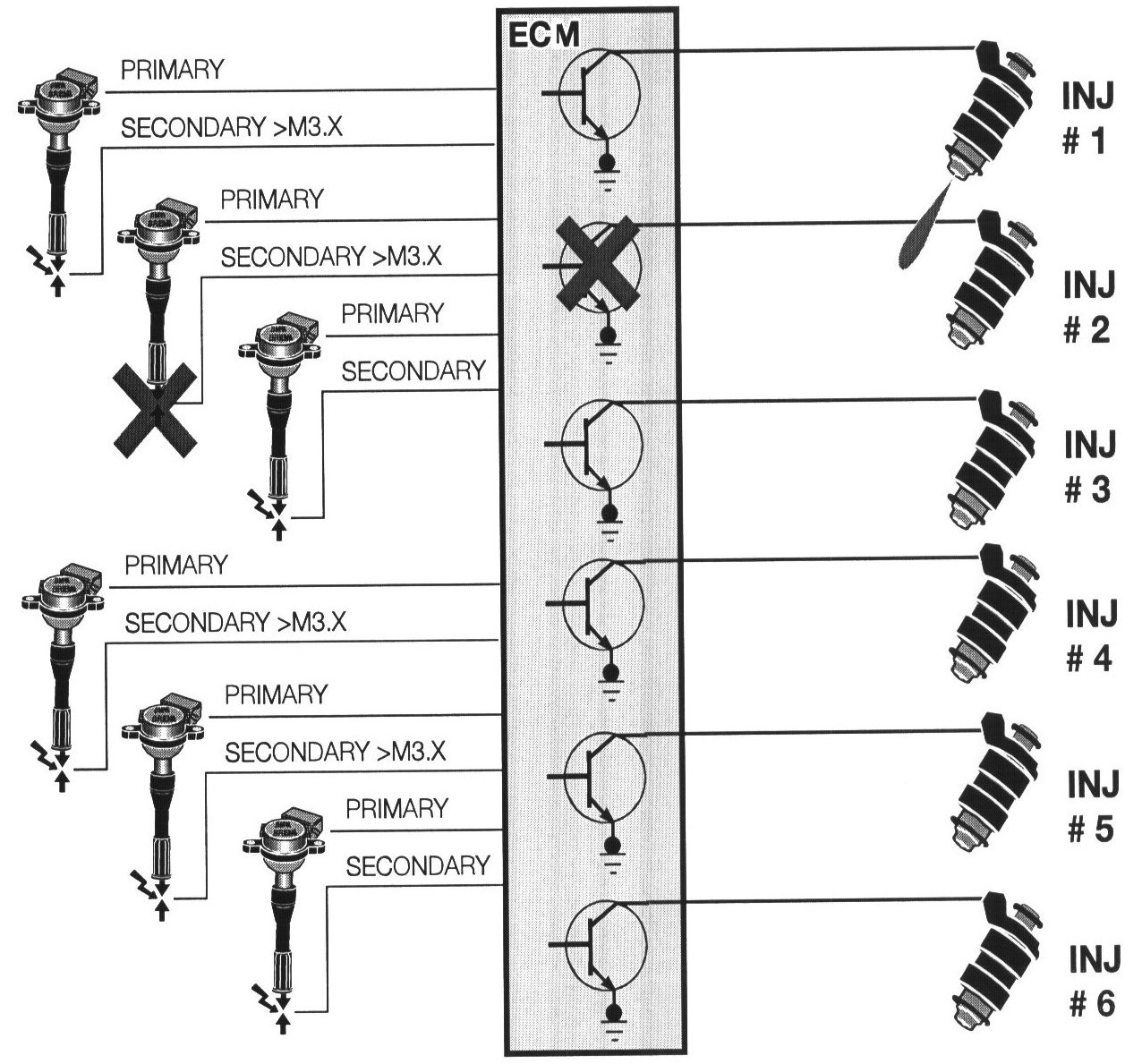 - M5.x/MS 41.x: The control module monitors the ignition primary final stages (all) and the secondary firing of the coils (all except M5.2 M44 & M62). These systems also monitor for cylinder misfire under OBD II compliancy. Cylinder misfire detection will also shut individual injectors off as needed to prevent catalytic converter damage.