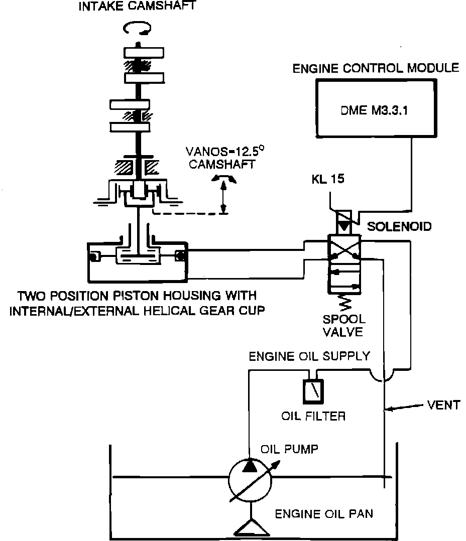 Based on engine speed, load and engine temperature, the control module activates an on/off solenoid that controls a spool valve. The spool valve is located in the piston housing and directs pressurized engine oil to either side of the piston to move the helical gear cup.