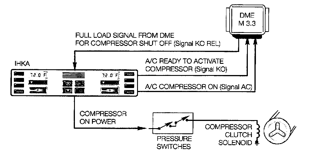 When the IHKA control module applies operating power to the compressor clutch solenoid it also supplies a 12 volt high signal to the DME for acknowledgement of compressor operation.