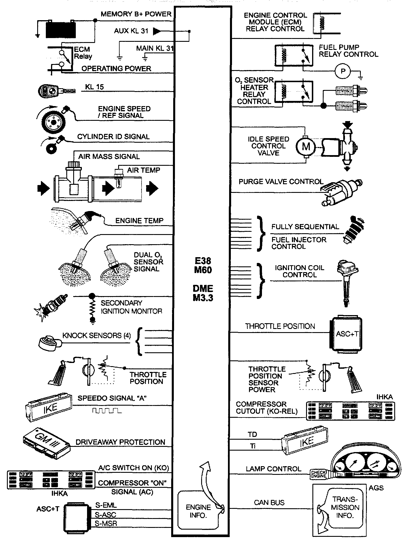 E38 DME M3.3 does not activate the AC compressor as did the E32 M60 M3.3. The E38 IHKA is now the controller of the compressor clutch.