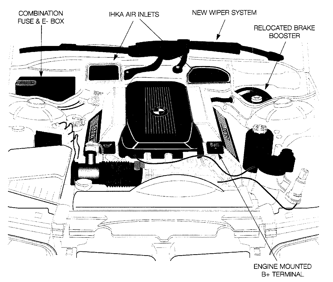 The E38 engine compartment has some new noticeable differences.