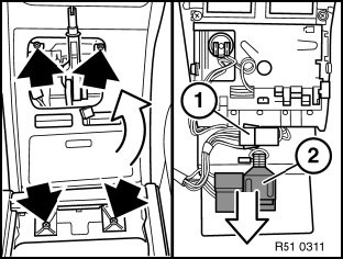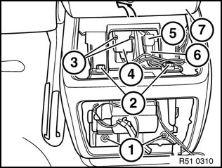 Disconnect plugs (4) and (5). Unlock connector housing (6) (if necessary after removal of center console) and remove.