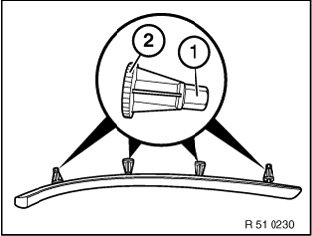 Fit outer plastic nuts with knurling (2) facing finisher and fit internal plastic nuts with hex (1) facing finisher (risk of damage to passenger airbag).