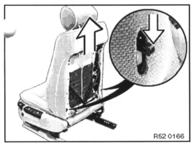 Unlock left and right levers (press downwards). Pull backrest upwards to remove from seat frame and lift out of vehicle.