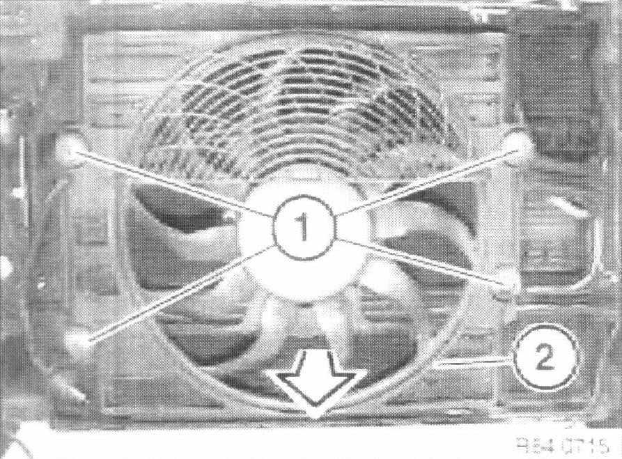 4. Unscrew nuts ( 1 ). Remove supplementary fan complete with fan cowl ( 2 ) in direction of arrow.