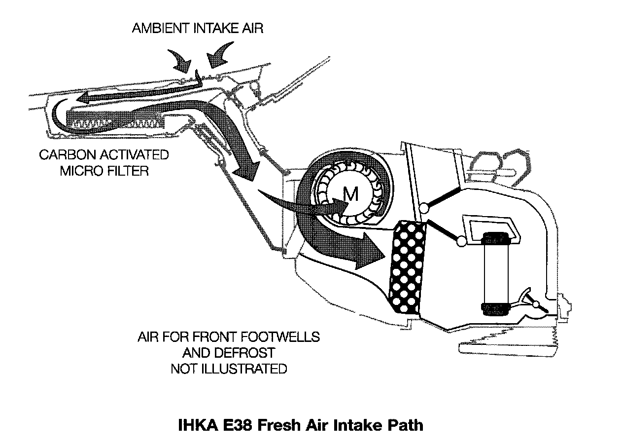 Fresh air enters the IHKA E38 system through inlet grilles at the trailing edge of the hood. It flows downward and forward into a plenum which houses the activated-charcoal micro- filter. After flowing through the filter, the air flows rearward and downward into the housing through air intake ducts.