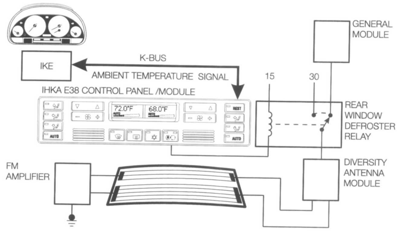 E38 vehicles are equipped with a windshield base/washer spray jet heater system similar to the one found on 1988 and 1989 E32 vehicles On E38 vehicles, however, both heater systems are powered at the same time by the same relay: