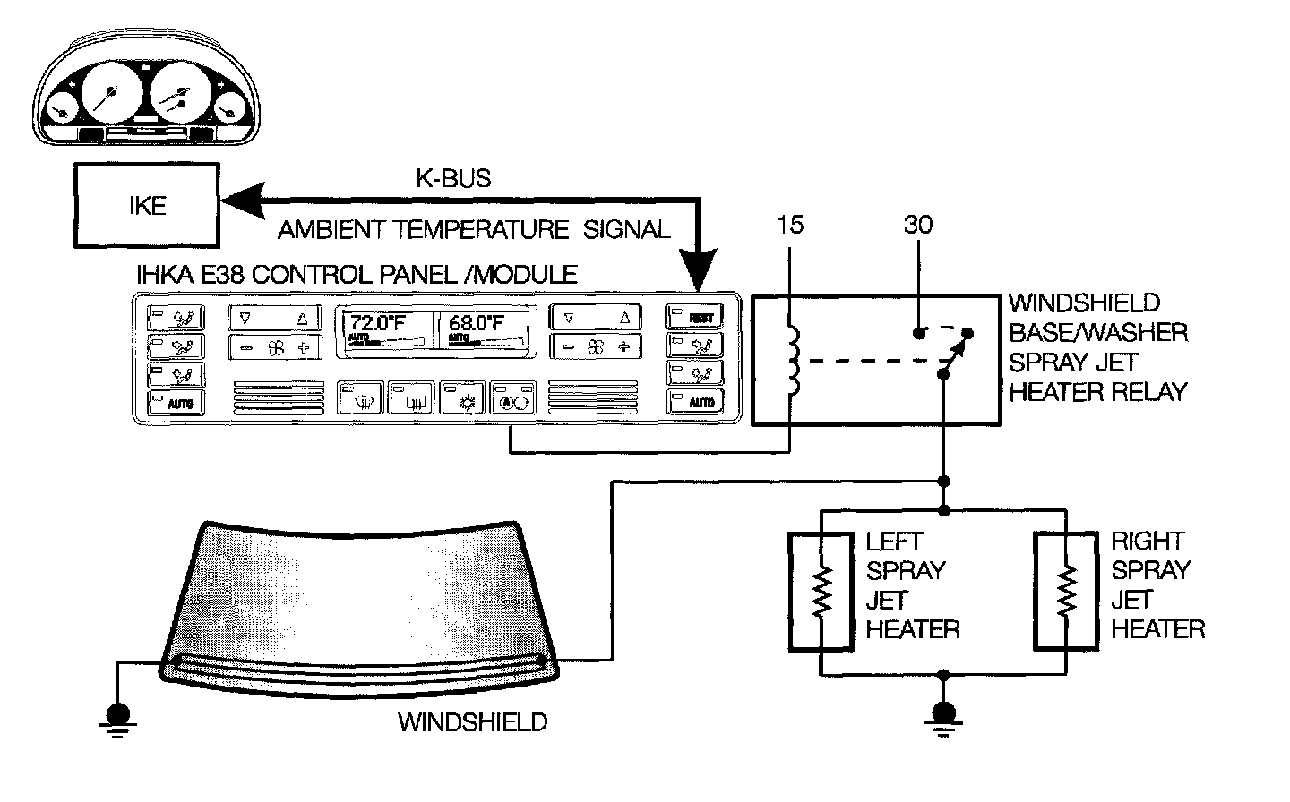 The control panel/module monitors the signal from the ambient temperature sensor (K-Bus) and automatically activates the windshield base/washer spray jet heater relay when:
