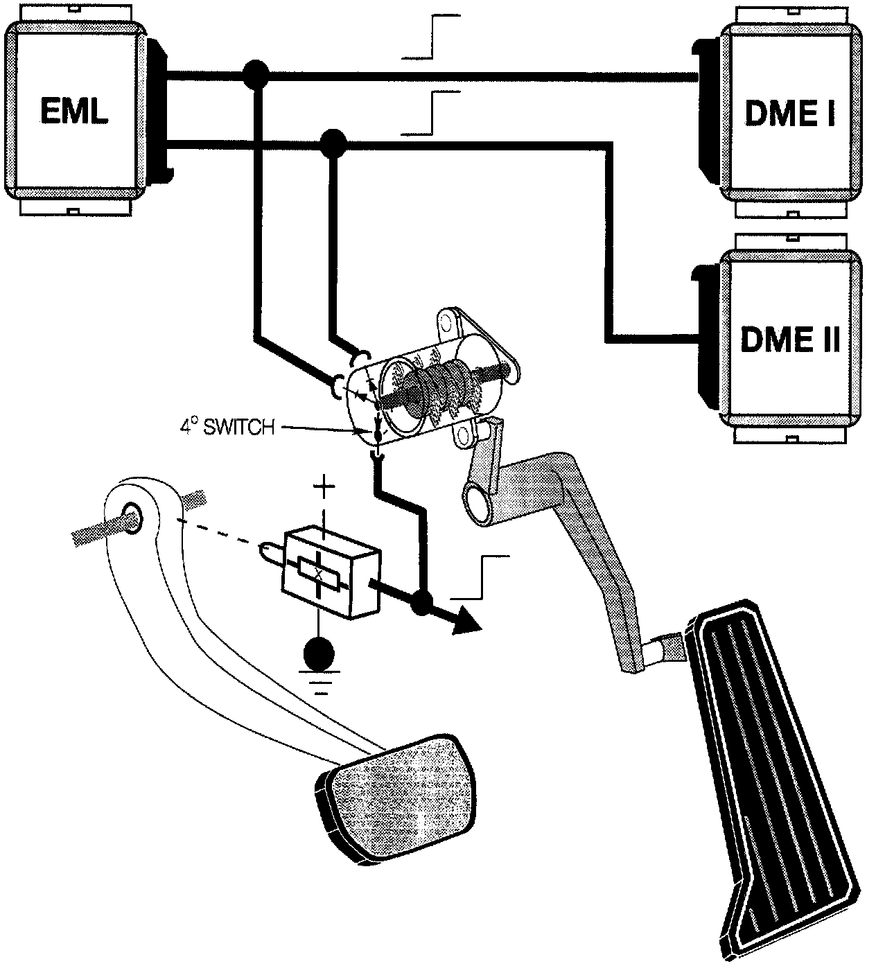 With the accelerator pedal released (4° switch closed) and the brake pedal pressed, a high signal is supplied (bypassing the EML control module) to the DME control modules to activate decel fuel cutoff.