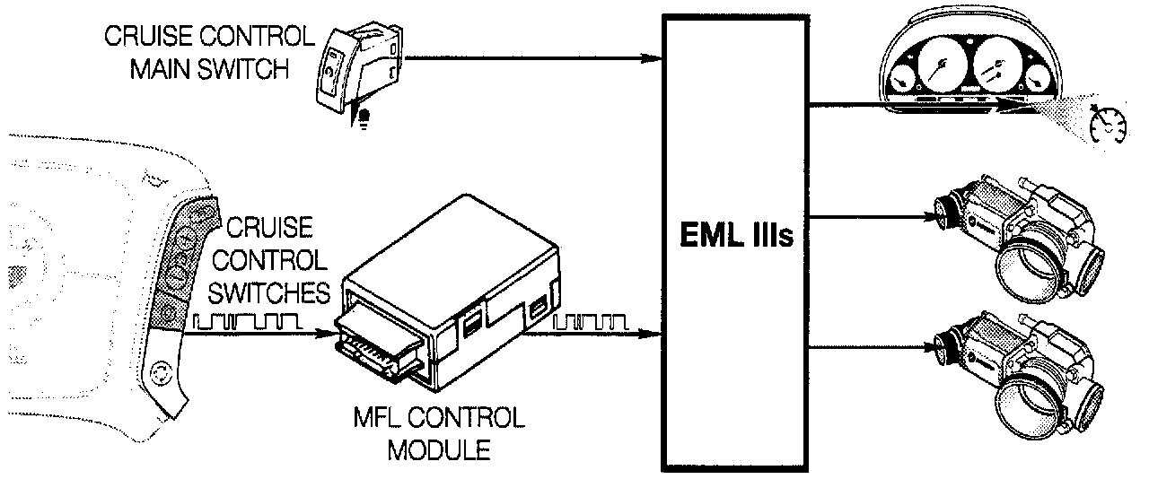 - Cruise control main switch - mounted on the instrument panel. Provides a switched ground input to the EML control module. (E38 only)
