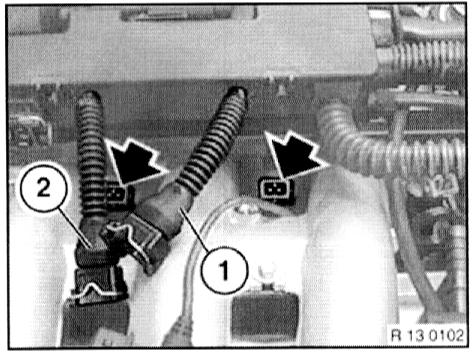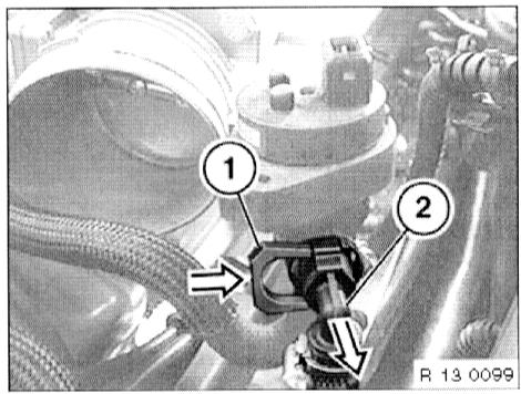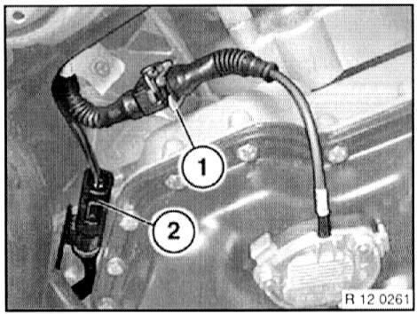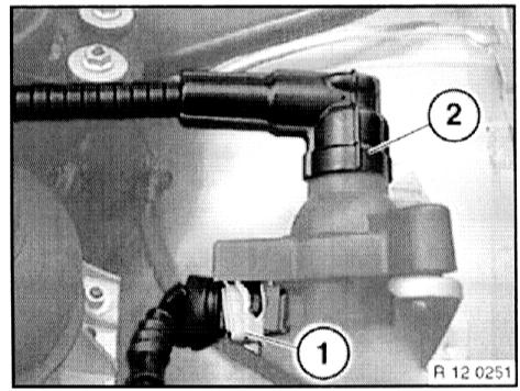 - Disconnect plug connection (1) from camshaft sensor and plug connection (2) from vacuum control unit.