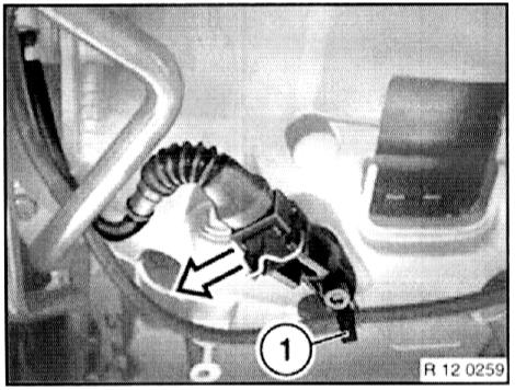 - Unfasten hose clip (2) from auxiliary hose for air pump.
