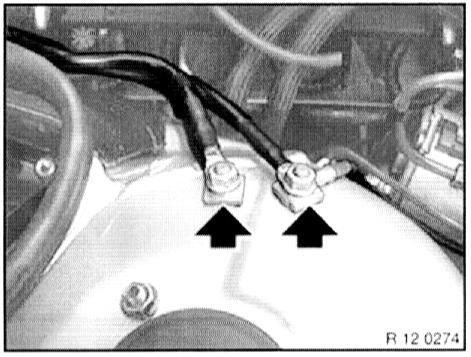 - Unfasten screw connection on positive battery line from positive battery terminal.