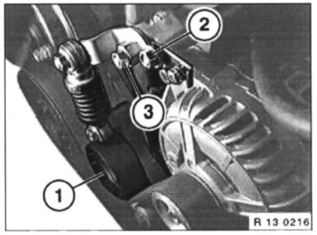 Unfasten screws (1 to 3). Remove complete tensioning roller for ribbed vee belt.