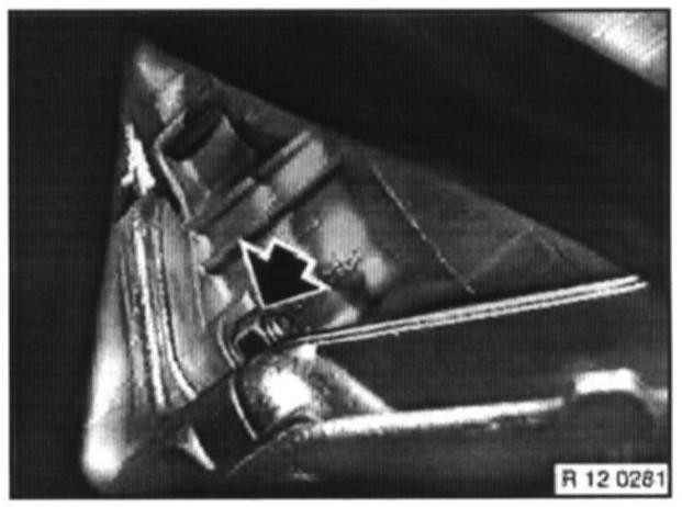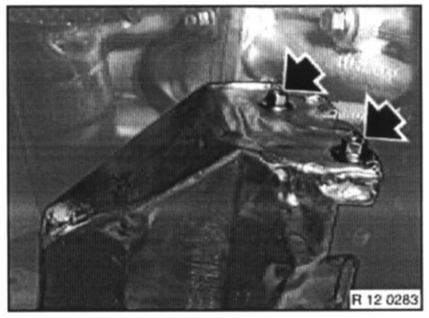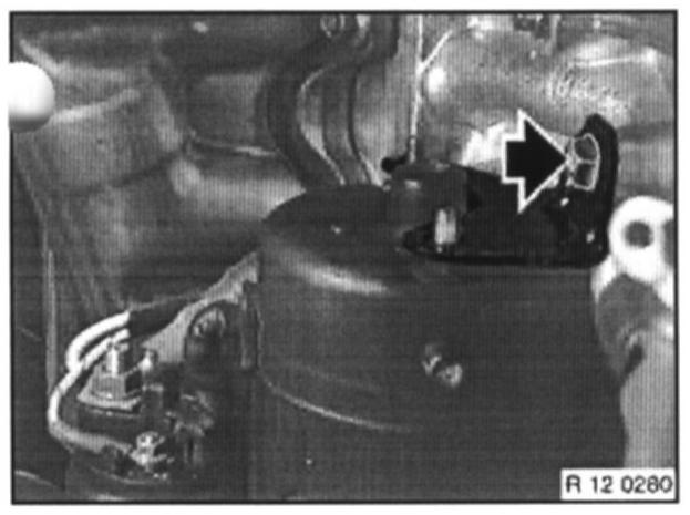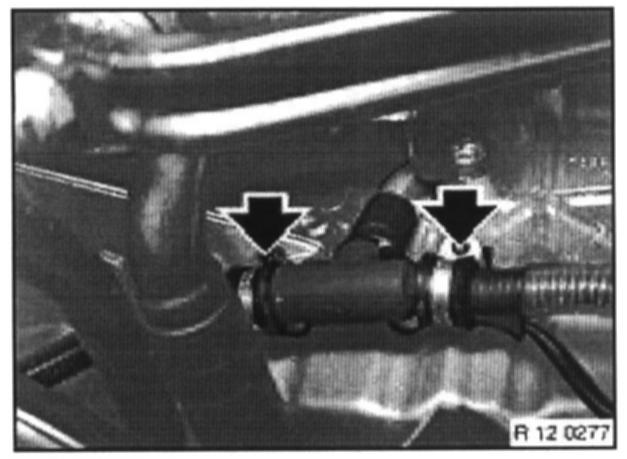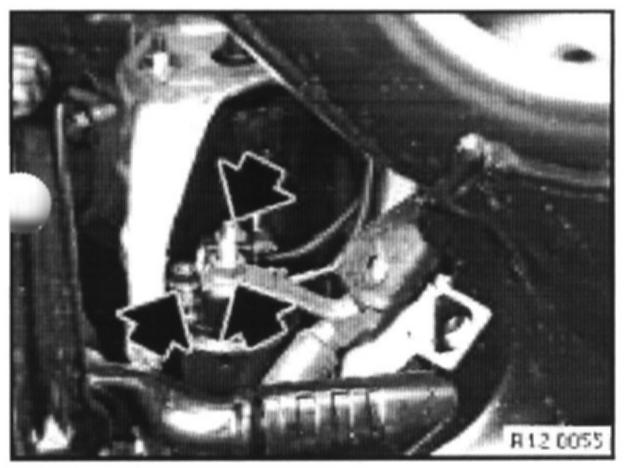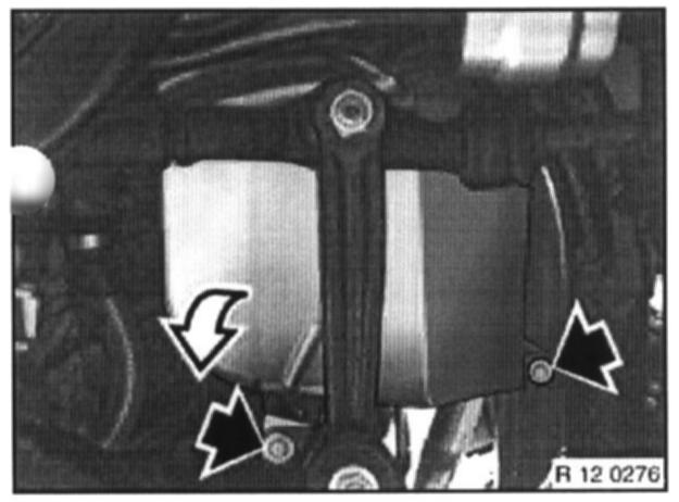 Unfasten screws in retaining plate on front axle support, unclip line and remove retaining plate.