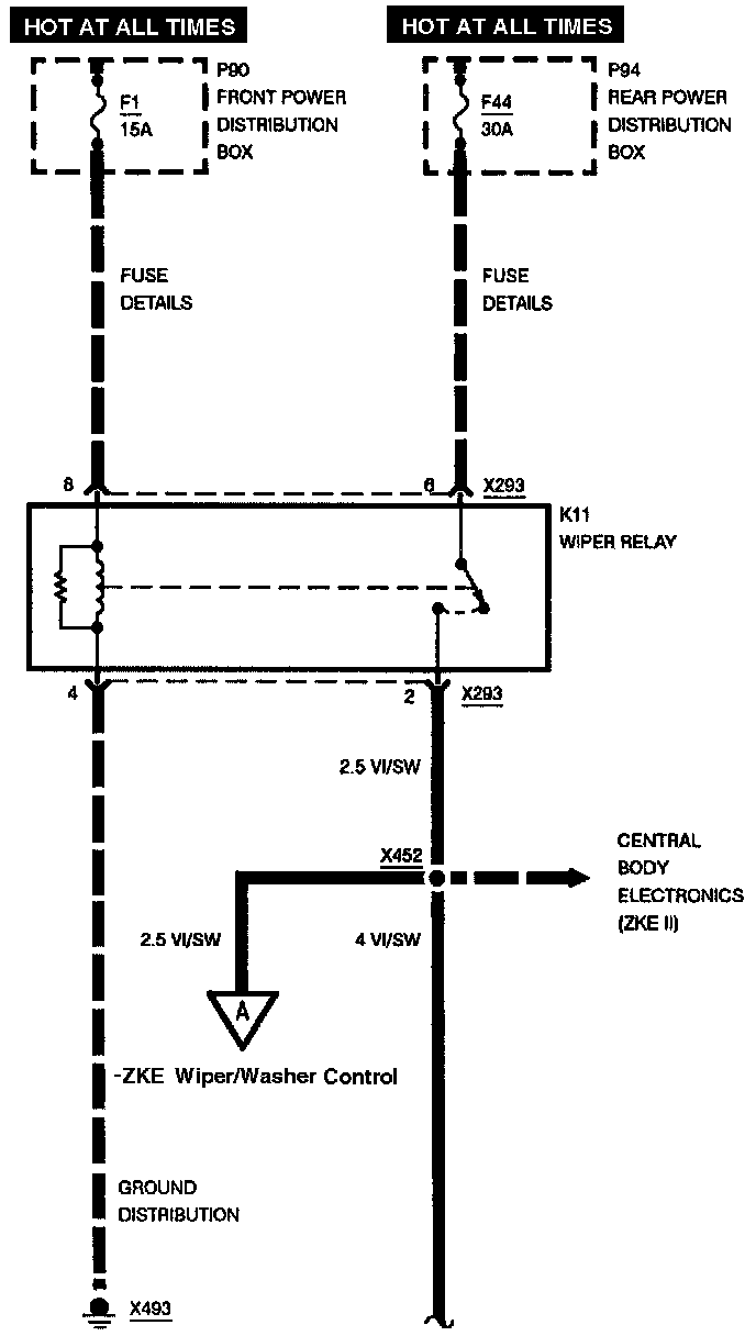 7. The dashed line from pin 4 of connector X293 to ground X493 shows the ground supply for relay K11. If required, refer to Ground Distribution at ground X493 for the complete line progression with all plug connections, line branches, wire colors and cross sections.