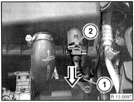 - Press in detent spring on plug connection (2) and separate plug connection (1).