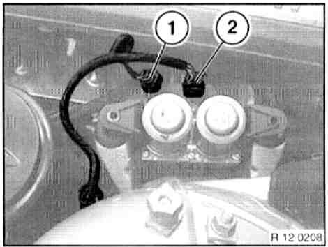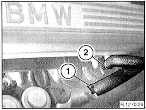- Unfasten hose clip (2) from auxiliary hose for air pump.