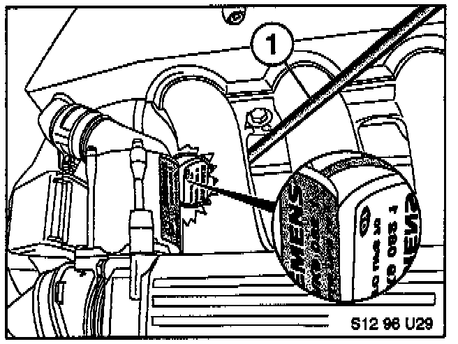 4. On the left side throttle housing assembly (DK motor) the bottom of the label can be seen by using a small flexible mirror (1) to view the bottom of the motor assembly and the bottom edge of the Siemens label.