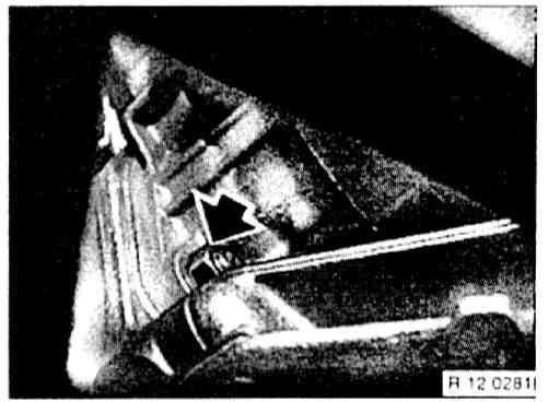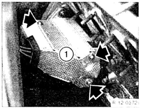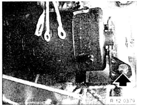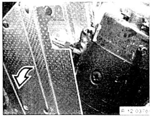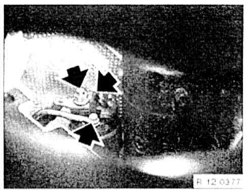 - Unfasten top screw and back screw from heat baffle plate on starter motor (illustrated here from above).
