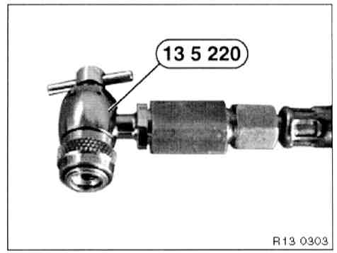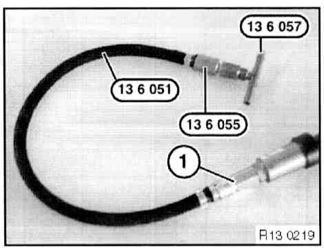 - Connect special tool 13 6 056/057 (T-piece) to special tool 13 6 055 (reducer) and special tool 13 6 051 (hose with quick release coupling).