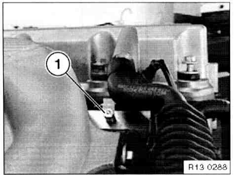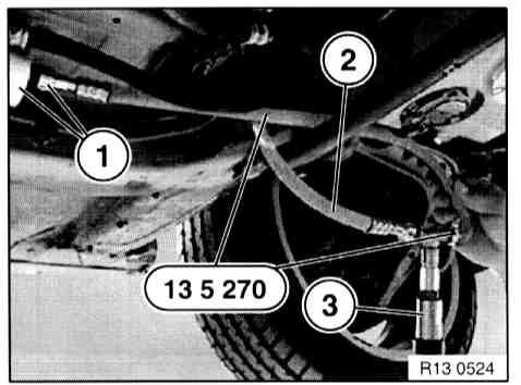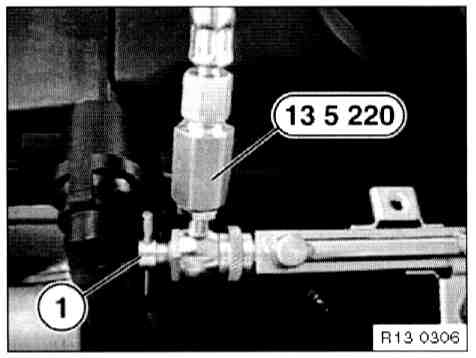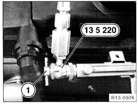 - Install special tool 13 5 270 between fuel filter and disconnected fuel hose (2).