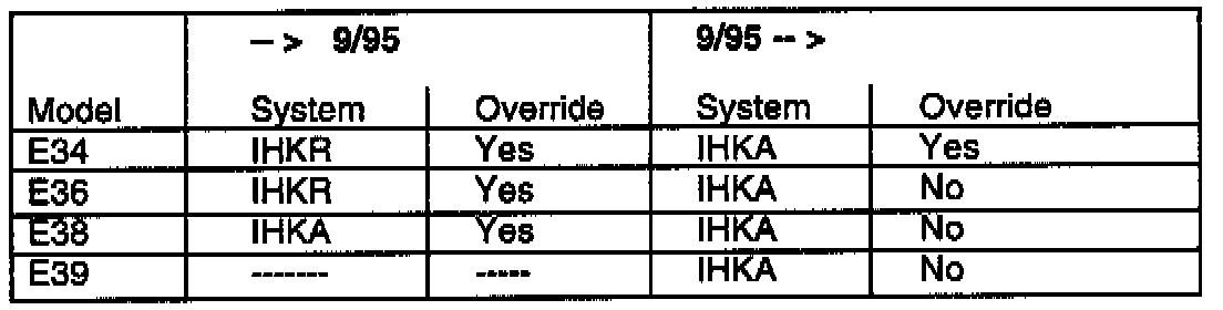 As of production date 9/95, the override function of the passenger side temperature settings will no longer be performed (IHKA control units with part numbers # 64118369781 or # 64118372482). Each side will work exactly according to its temperature setting, regardless of the temperature the other side has chosen.