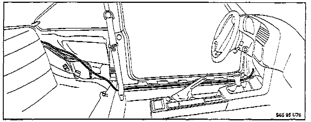 5. Route cable through interior: under left rocker panel trim strip (behind carpeting), behind left front kick panel and knee protector, behind dash board to radio. Leave sufficient cable length for radio removal servicing.