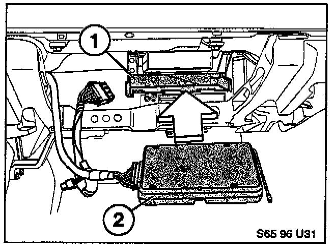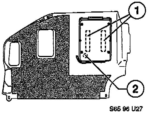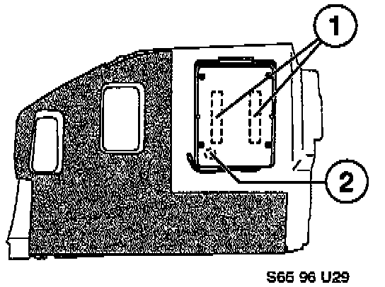 Affix Velcro(R) strips (1) to the upper surface of the alarm module. The BMW label and microphone opening must face down when mounting the alarm module. Mount the alarm on the trim panel as shown, positioning the module so that the microphone (2) is aligned over the 19 mm (3/4") diameter hole. Reinstall the trim panel.