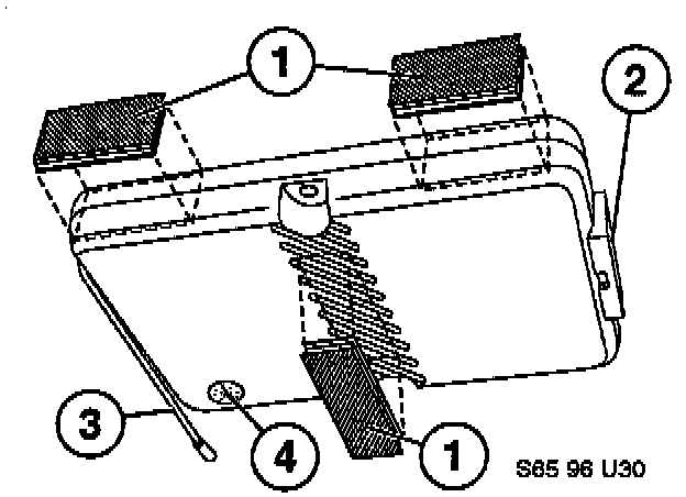 Reassemble the alarm module. Affix Velcro(R) strips (1) to the replacement module as shown. Position the alarm module so that the antenna (3) is on the right side, the alarm harness (2) is on the left side, and the integrated microphone (4) is facing down.