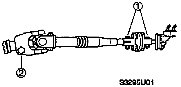 With the steering wheel locked in the center position, remove the bolts holding the Hardy disc and upper steering clamp, and remove the Hardy disc and spindle. When removing the spindle, spread the upper clamp (2) with a screwdriver or similar tool, so that the spindle comes off the shaft easily. If excessive force is used to pull on the spindle, the upper column could possibly be pulled loose from its mounts under the dash.