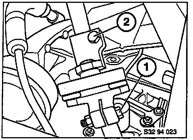Center the bolt holes in position and install the locking bolts and nuts in the steering rack clamp (1) and lower spindle clamp (2). Tighten to 19 Nm.