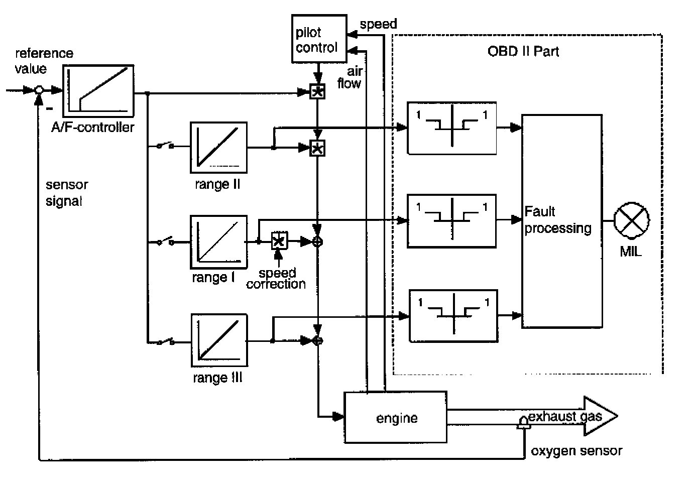 Drifts and faults in sensors and actuators of the fuel delivery system as well as not measured air leakage influence the pilot control. This causes increasing deviations of the air/fuel ratio. The adaptive pilot control effects the controller correction in three different ranges.